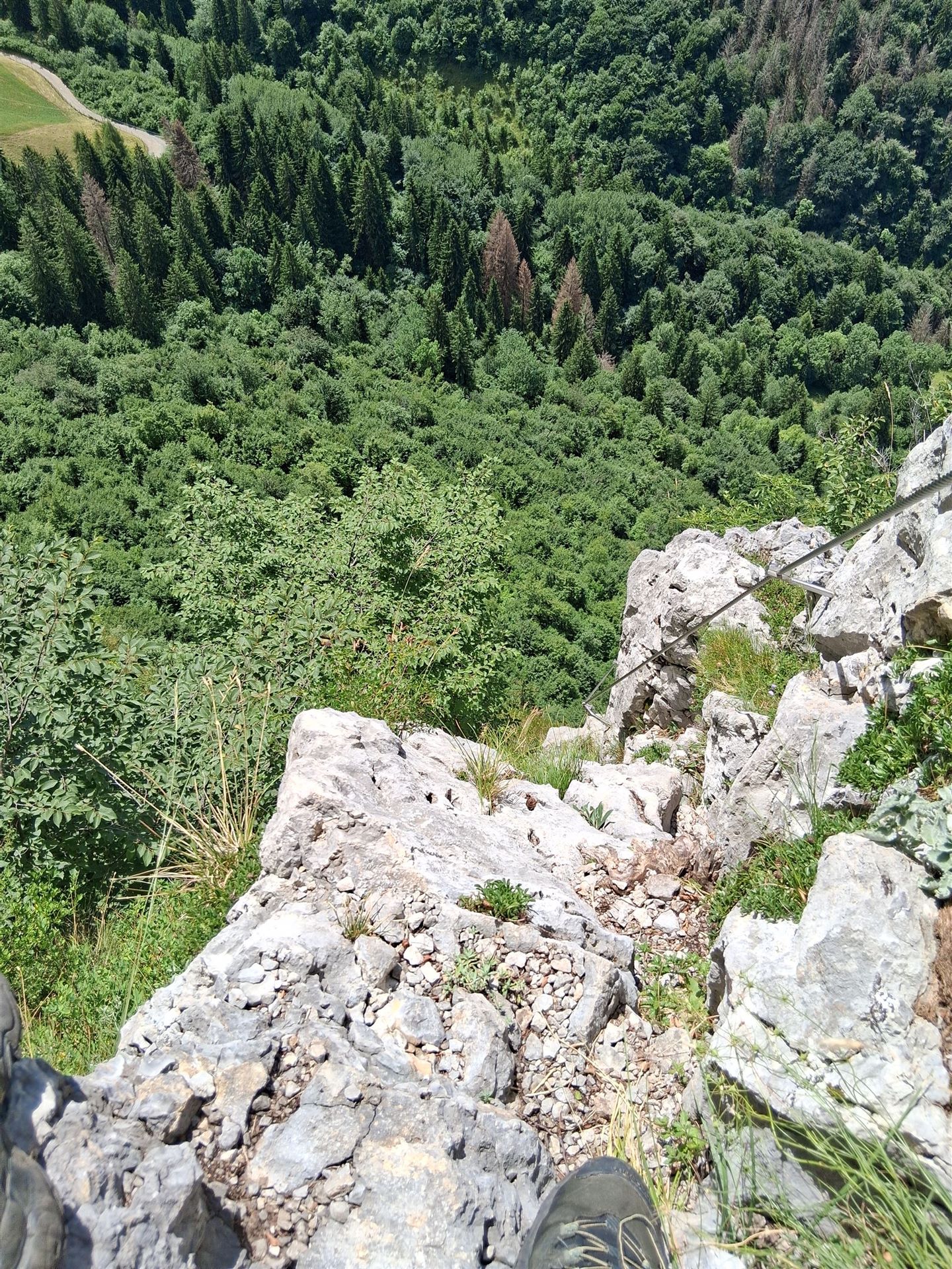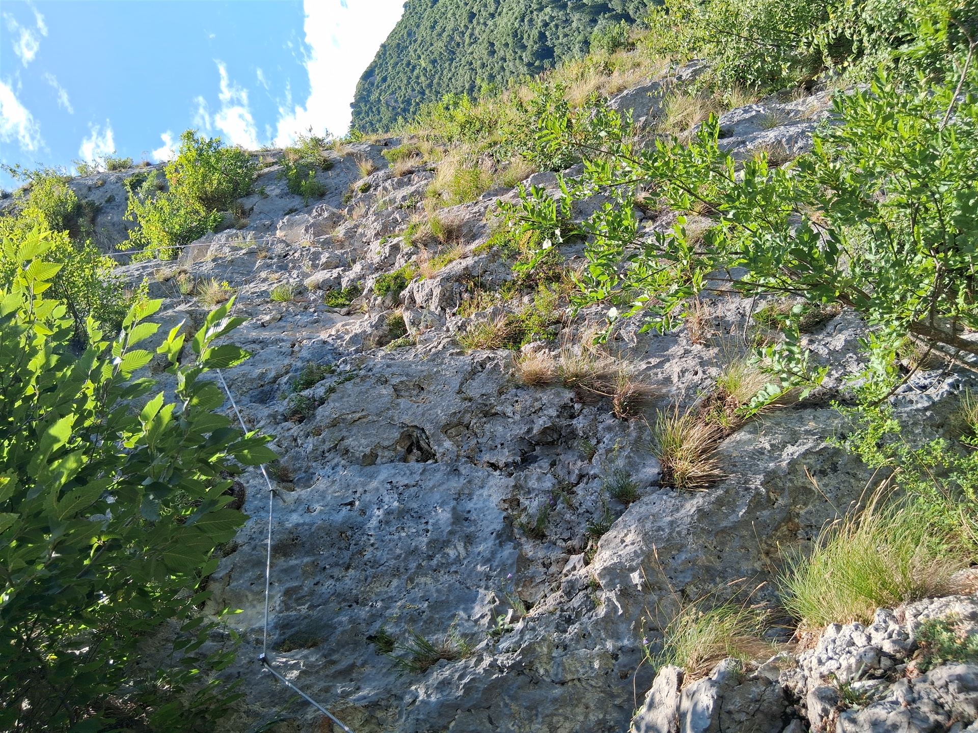 Ab dem Einstieg zeigt die Ferrata sofort, was sie will: Kraft, Konzentration und saubere Bewegungen. Der Fels ist steil, die Passagen sind knackig, stellenweise richtig fordernd. Das ist kein Steig, den man „mal eben“ macht.